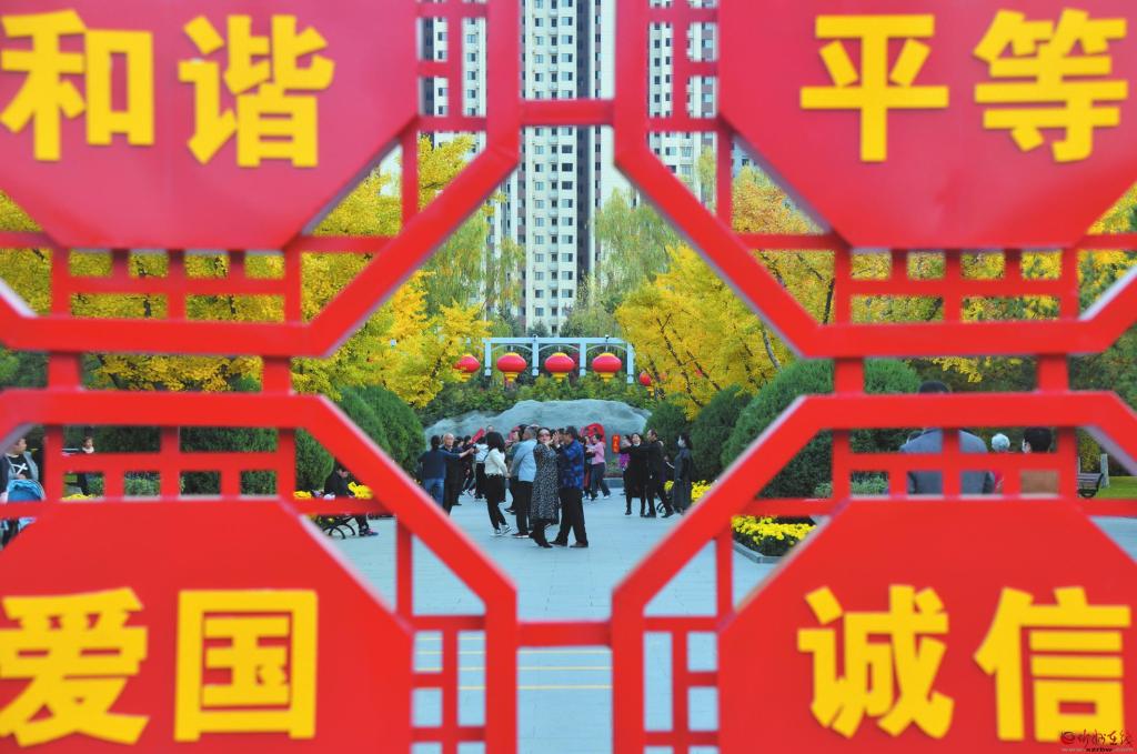 在我市中心城區(qū)的公園、廣場(chǎng)和城市綠地中,以社會(huì)主義核心價(jià)值觀、文明城市創(chuàng)建、優(yōu)秀傳統(tǒng)文化等為主題的宣傳展板、景觀造型隨處可見(jiàn),在弘揚(yáng)傳統(tǒng)文化、傳播城市文明的同時(shí),給市民帶來(lái)視覺(jué)上的藝術(shù)享受,讓游客在游園賞景中受到熏陶。 (張存良 攝)