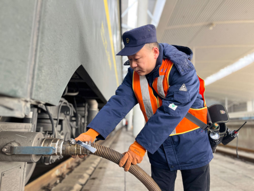 作為山西境內(nèi)唯一的通過車吸污作業(yè)點,太原南站吸污作業(yè)點全年無休,承擔(dān)著通過太原南站的普速、動車、高鐵的吸污作業(yè)。春運期間,吸污工作量加大,除去臨時加增的吸污作業(yè)任務(wù),每天從早上7點至夜間12點,固定有14輛列車需要進(jìn)行吸污作業(yè)。