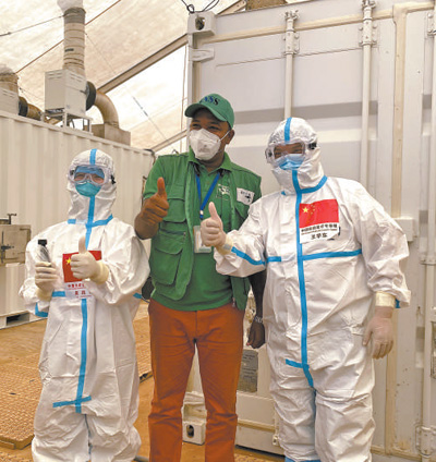 2020年9月2日,在幾內(nèi)亞首都科納克里的一個核酸檢測取樣點,中國抗疫醫(yī)療專家組成員與當?shù)毓ぷ魅藛T合影。新華社發(fā)