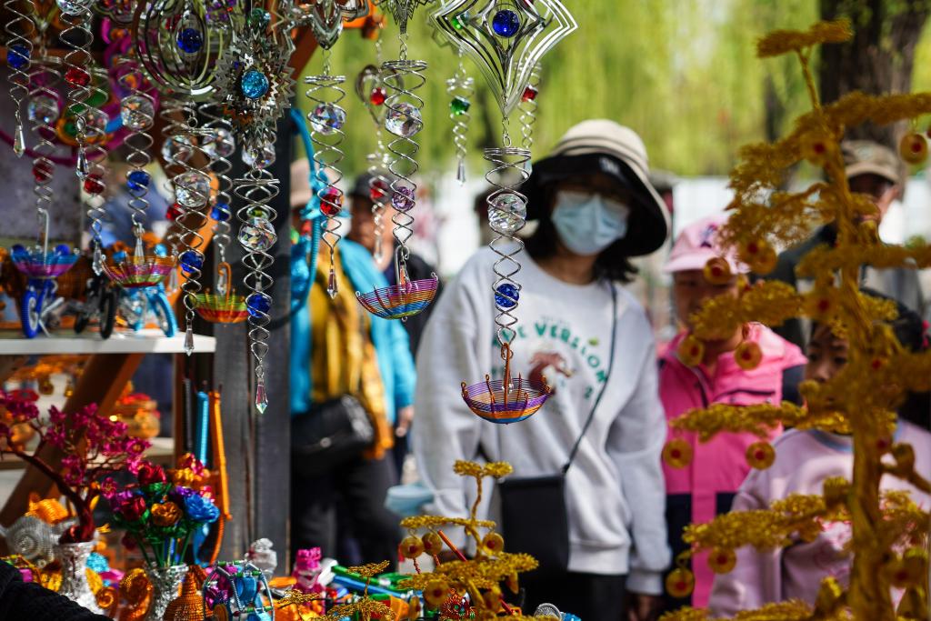 2024年4月5日,游客在濟(jì)南曲水亭街參觀傳統(tǒng)手工藝品。新華社記者 朱崢 攝