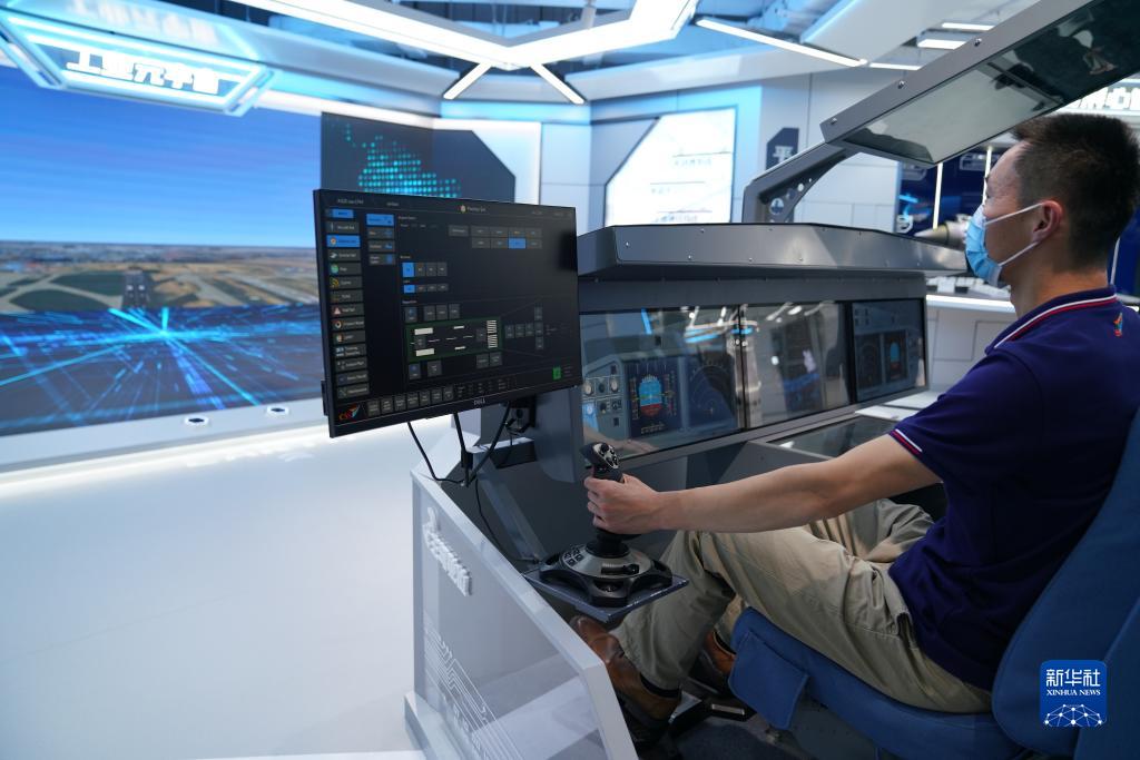 5月11日,在上海城市數(shù)字化轉(zhuǎn)型體驗(yàn)館,工作人員操作一款數(shù)字化飛行仿真訓(xùn)練平臺(tái)。新華社記者 馬寧 攝