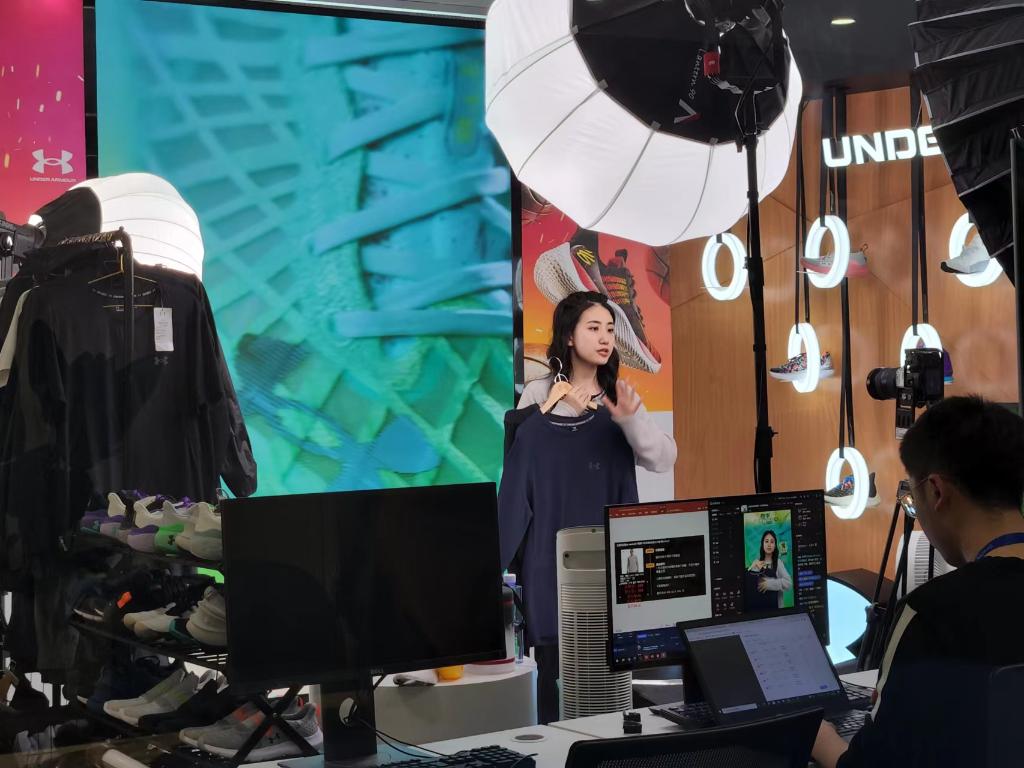 百秋公司直播中心里主播正在線上展示國際品牌服飾。新華社記者王默玲 攝