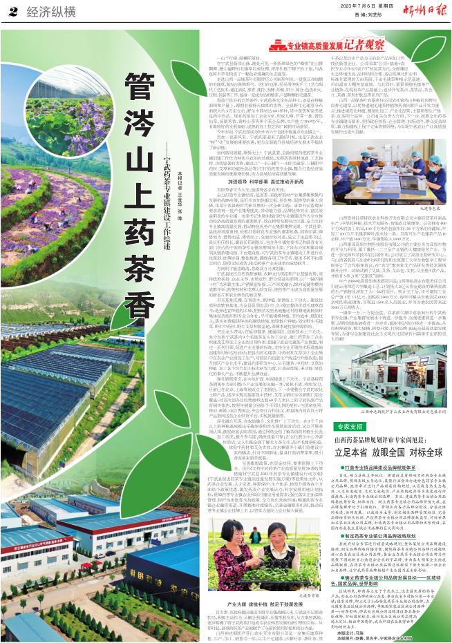為促進(jìn)寧武藥茶專業(yè)鎮(zhèn)高質(zhì)量發(fā)展,寧武縣以優(yōu)質(zhì)資源要素為支撐,堅(jiān)持政府扶持、企業(yè)管理、市場(chǎng)運(yùn)作、整合推進(jìn)的原則,全縣實(shí)施包括“市場(chǎng)主體倍增”“創(chuàng)新能力提升”“就業(yè)富民賦能”“質(zhì)量品牌提升”“銷售市場(chǎng)拓展”“重大項(xiàng)目攻堅(jiān)”和“產(chǎn)業(yè)要素保障”等在內(nèi)的七大行動(dòng),以1軸4鎮(zhèn)10村為承載主體,產(chǎn)銷緊密銜接,三產(chǎn)深度融合,縱向延鏈和橫向成群并舉,藥茶藥材和功能食品互促,推動(dòng)藥茶產(chǎn)業(yè)由成型向成勢(shì)躍升。