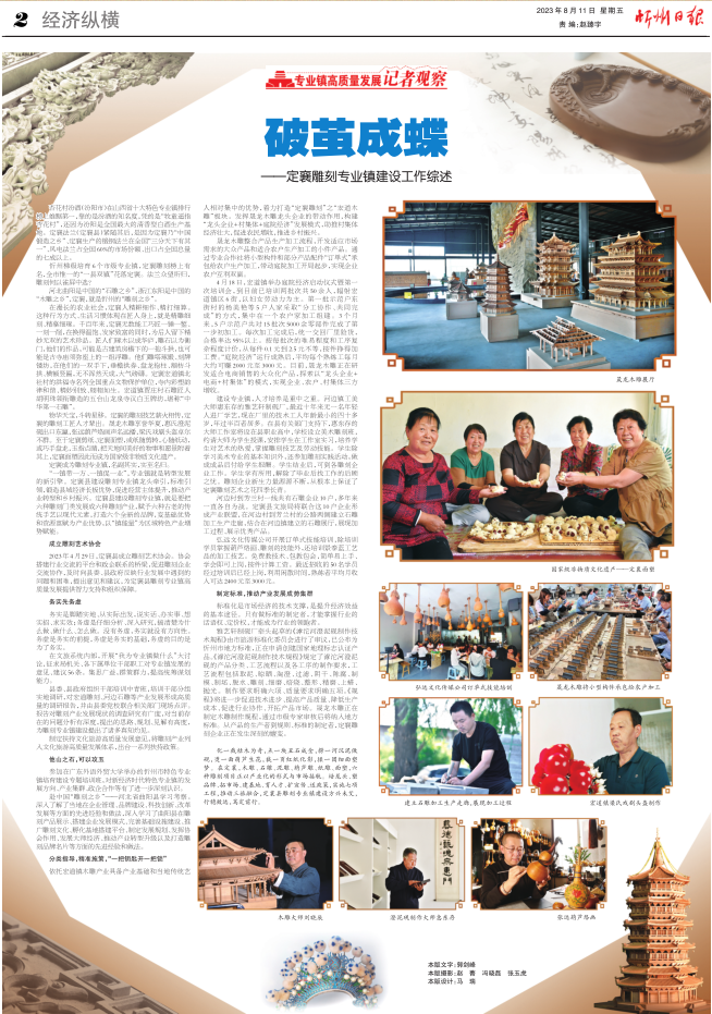 “一鎮(zhèn)帶一方、一鎮(zhèn)促一業(yè)”,專業(yè)鎮(zhèn)就是轉(zhuǎn)型發(fā)展的新引擎。定襄縣建設(shè)雕刻專業(yè)鎮(zhèn)龍頭牽引,標(biāo)準(zhǔn)引領(lǐng),鍛造縣域經(jīng)濟(jì)長板優(yōu)勢,促進(jìn)經(jīng)營主體提升,推動(dòng)產(chǎn)業(yè)轉(zhuǎn)型和鄉(xiāng)村振興。定襄縣建設(shè)雕刻專業(yè)鎮(zhèn),就是要把六種雕刻門類發(fā)展成六種雕刻產(chǎn)業(yè),賦予六種古老的傳統(tǒng)手藝以現(xiàn)代元素,打造六個(gè)全新的品牌,變基礎(chǔ)優(yōu)勢和資源稟賦為產(chǎn)業(yè)優(yōu)勢,以“鎮(zhèn)能量”為區(qū)域特色產(chǎn)業(yè)增勢賦能。