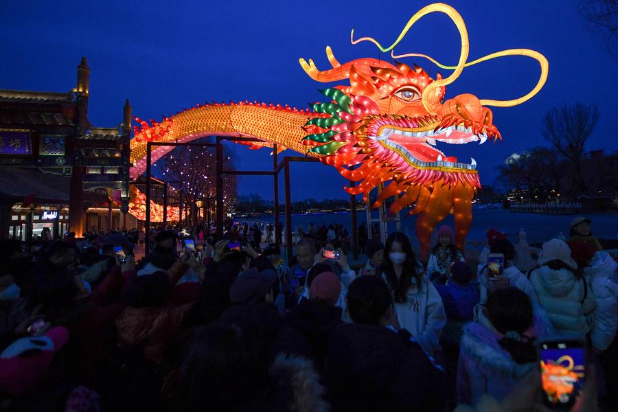 2月14日,在北京市西城區(qū)什剎海荷花市場,游客觀賞巨型龍燈“蛟龍出海”。新華社記者 鞠煥宗 攝