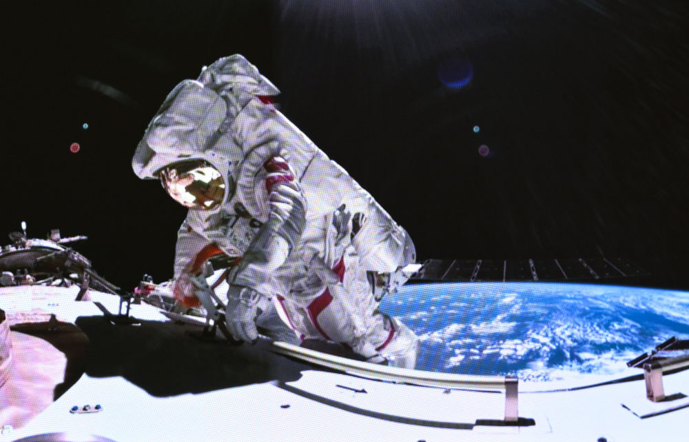 這是2024年3月2日在北京航天飛行控制中心拍攝的神舟十七號航天員湯洪波在空間站組合體艙外作業(yè)的畫面。