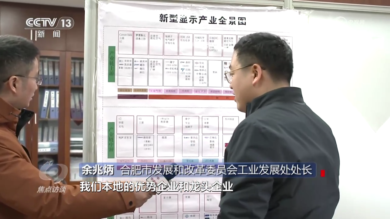 合肥市發(fā)展和改革委員會工業(yè)發(fā)展處處長余兆炳:“新型顯示產(chǎn)業(yè)全景圖上面顯示了合肥市發(fā)展新型顯示的產(chǎn)業(yè)鏈的上游、中游、下游本地的優(yōu)勢企業(yè)和龍頭企業(yè),有這個全景圖,我們對標(biāo)作戰(zhàn)、掛圖作戰(zhàn)非常可視化作戰(zhàn)。”
