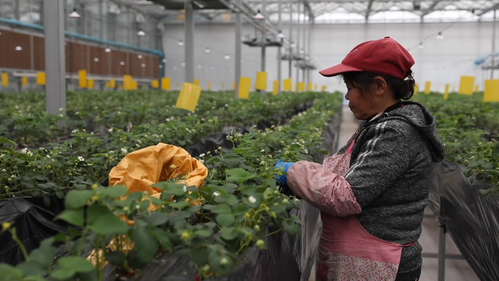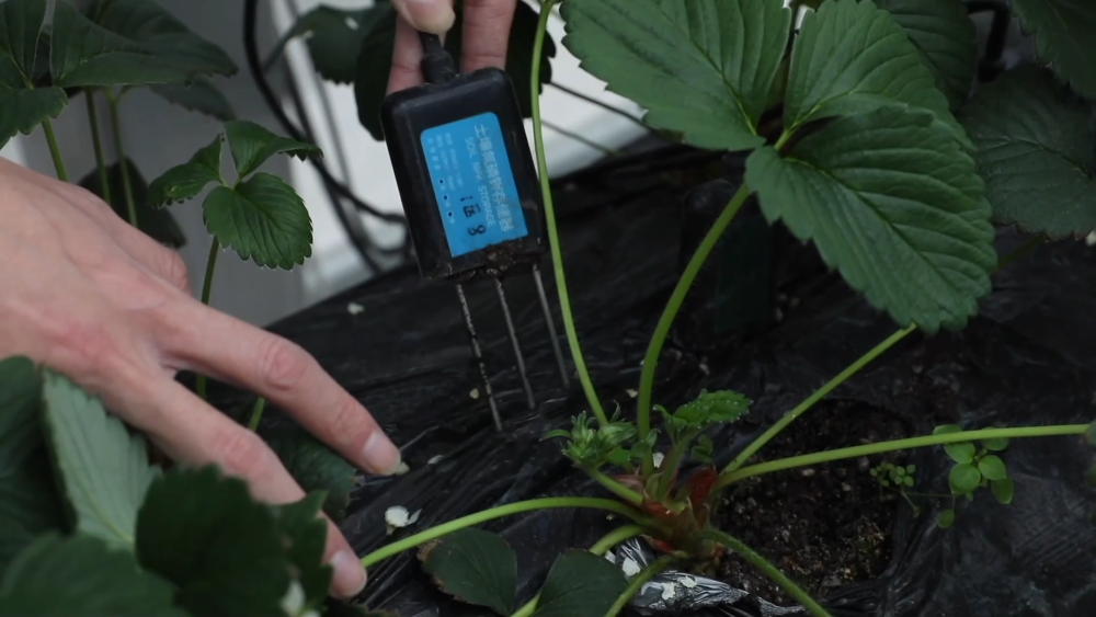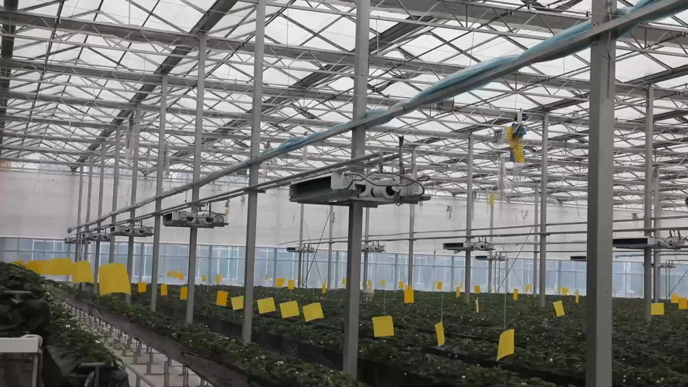 智慧農(nóng)場(chǎng)玻璃溫室現(xiàn)共種植三個(gè)品種、八萬(wàn)株草莓,均為自主繁育的草莓苗。科學(xué)種植促進(jìn)了豐產(chǎn),兩座玻璃溫室均可實(shí)現(xiàn)一年四季連續(xù)生產(chǎn)。