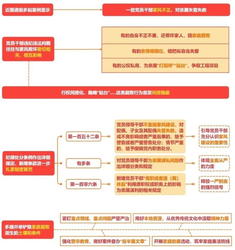 新修訂的《中國共產(chǎn)黨紀律處分條例》第一百五十二條對黨員領(lǐng)導干部“不重視家風建設(shè),對配偶、子女及其配偶失管失教,造成不良影響或者嚴重后果”的情況作出規(guī)定,引導黨員干部充分認識家風建設(shè)的重要性。