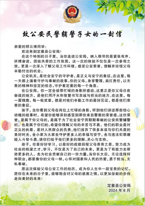 為進(jìn)一步增強(qiáng)中小學(xué)生反詐、禁毒、交通安全意識(shí),通過小手拉大手等形式,大力學(xué)習(xí)、宣傳、弘揚(yáng)武霖同志英勇無畏、忠誠(chéng)為民的高尚品質(zhì)。8月20日上午,定襄縣公安局精心策劃,組織開展了“警娃探警營(yíng)”主題警營(yíng)體驗(yàn)日活動(dòng),50余名民輔警子女和警爸警媽共同走進(jìn)警營(yíng),體驗(yàn)警察生活、感受警營(yíng)文化。
