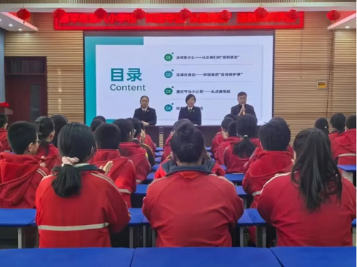 課堂上,檢察官任慧英用通俗易懂的語言,向同學(xué)們講解法律的定義,并結(jié)合小學(xué)生生活場景,引導(dǎo)大家思考“班規(guī)與法律的區(qū)別”“如何用法律保護(hù)自己”。針對校園欺凌、網(wǎng)絡(luò)詐騙等熱點問題,通過真實案例傳授學(xué)生自我保護(hù)技巧。課后,在檢察干警的帶領(lǐng)下,全體學(xué)生高舉右拳,莊嚴(yán)宣誓,并在主題橫幅上鄭重簽名,許下爭當(dāng)守法小公民的承諾。
