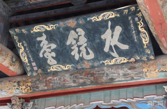 “水鏡臺”匾。水鏡臺是一座古戲臺,懸掛匾額“水鏡臺”?!八R”之名取自《漢書》名句“清水明鏡不可以形逃”,寓意為人世間的善惡忠奸盡人皆知。此匾由清乾隆翰林、著名書法家楊二酉所題,書體清秀,筆力遒勁。
