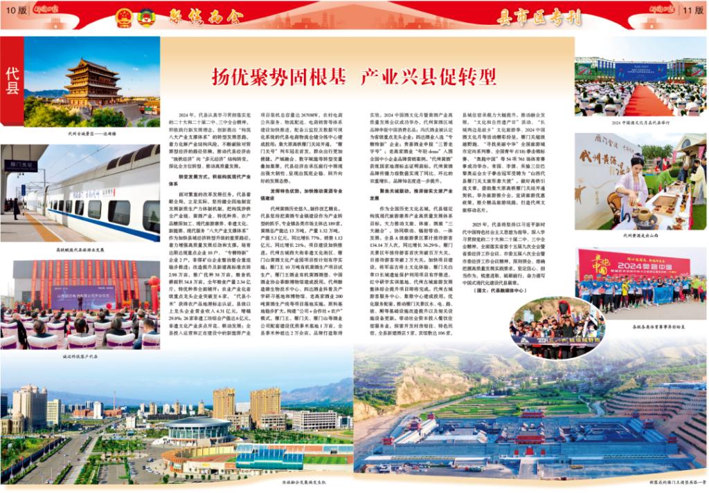 2024年,代縣認(rèn)真學(xué)習(xí)貫徹落實黨的二十大和二十屆二中、三中全會精神,積極踐行新發(fā)展理念,創(chuàng)新提出“構(gòu)筑八大產(chǎn)業(yè)支撐體系”的轉(zhuǎn)型發(fā)展思路,著力化解產(chǎn)業(yè)結(jié)構(gòu)風(fēng)險,不斷破除對資源型經(jīng)濟(jì)的路徑依賴,推動代縣經(jīng)濟(jì)由“獨(dú)鐵經(jīng)濟(jì)”向“多元經(jīng)濟(jì)”結(jié)構(gòu)轉(zhuǎn)變,深化全方位轉(zhuǎn)型、推動高質(zhì)量發(fā)展。