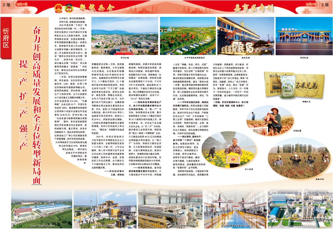 一年來,忻府區(qū)堅(jiān)持統(tǒng)籌兼顧、承壓奮進(jìn),全區(qū)經(jīng)濟(jì)運(yùn)行平穩(wěn)有序,GDP、固投、社零三項(xiàng)經(jīng)濟(jì)指標(biāo)絕對(duì)值繼續(xù)領(lǐng)跑全市。堅(jiān)持因地制宜、深化轉(zhuǎn)型,新質(zhì)生產(chǎn)力加快發(fā)展,全力以赴做好24個(gè)省市重點(diǎn)工程服務(wù)保障工作,全年完成投資123.15%,“專精特新”企業(yè)達(dá)到18戶,年度任務(wù)完成率100%,溫泉康養(yǎng)和資源再生利用兩個(gè)市級(jí)專業(yè)鎮(zhèn)全年完成營收14.68億元,忻州古城入選“全省非遺與旅游深度融合典型案例”,頓村、奇村省級(jí)旅游度假區(qū)評(píng)審成績名列全省前茅。堅(jiān)持創(chuàng)新引領(lǐng)、重點(diǎn)帶動(dòng),改革步伐穩(wěn)健有力,國企改革深化拓展,區(qū)糧油加工廠等公司實(shí)現(xiàn)國有資產(chǎn)保值增值,醫(yī)療改革成效顯著,鄉(xiāng)村兩級(jí)醫(yī)療衛(wèi)生機(jī)構(gòu)標(biāo)準(zhǔn)化建設(shè)達(dá)標(biāo)率超過95%,教育改革扎實(shí)推進(jìn),一職中成為省高水平中等職業(yè)學(xué)校建設(shè)單位,整體教育教學(xué)質(zhì)量穩(wěn)居全市第一方陣。堅(jiān)持穩(wěn)糧保供、提質(zhì)增效,鄉(xiāng)村全面振興扎實(shí)推進(jìn),全區(qū)糧食作物播種面積完成2024年指標(biāo)任務(wù)的105%,鹽堿地綜合利用項(xiàng)目全面開工,5個(gè)精品示范村、22個(gè)提檔升級(jí)村取得階段性成效,榮獲全省學(xué)習(xí)運(yùn)用“千萬工程”經(jīng)驗(yàn)成效明顯先進(jìn)市縣。堅(jiān)持生態(tài)保護(hù)、綠色發(fā)展,厚植生態(tài)底色,全年大氣優(yōu)良天數(shù)281天,全年重污染天氣同比減少,定襄橋國考斷面水質(zhì)達(dá)地表水Ⅲ級(jí)優(yōu)良水質(zhì),中央、省級(jí)2.8萬畝造林任務(wù)全部完成,南云中河EOD項(xiàng)目入選國家示范支持項(xiàng)目。堅(jiān)持以人民為中心、積極回應(yīng)群眾期盼,人民群眾獲得感幸福感安全感持續(xù)增強(qiáng),老舊小區(qū)改造完工率達(dá)91%,“煤改電”鞏固提升改造成效顯著。