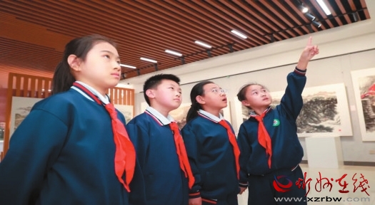 沿著“心靈之塔”臺階緩步而上,學(xué)生們駐足細讀,指尖摩挲著書中的文字,如同觸摸智慧的密碼。轉(zhuǎn)入書畫展廳,一幅幅水墨長卷鋪展開來,學(xué)生們與千年山水完成了一場跨越時空的對話。