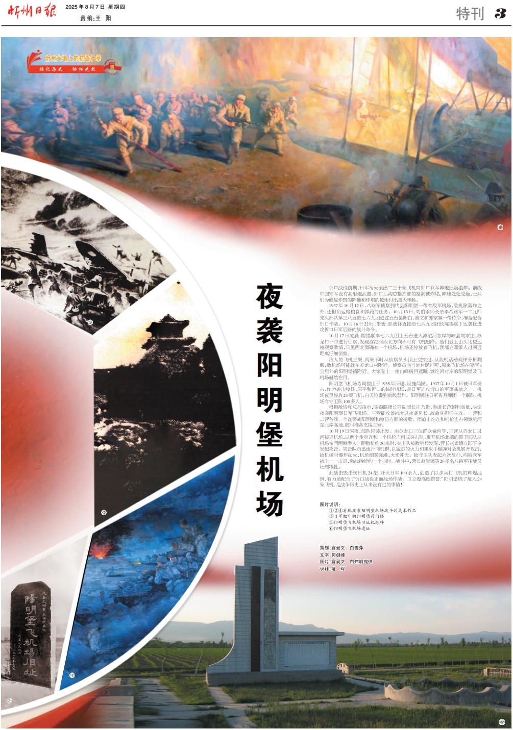 敵人的飛機三架、兩架不時從偵察員頭頂上空掠過,從敵機活動規(guī)律分析判斷,敵機場可能就在蘇龍口村附近。偵察員向當?shù)卮迕翊蚵?,原來飛機場在隔河5公里外的陽明堡鎮(zhèn)附近。大家登上一座山峰極目遠眺,滹沱河對岸的陽明堡及飛機場赫然在目。