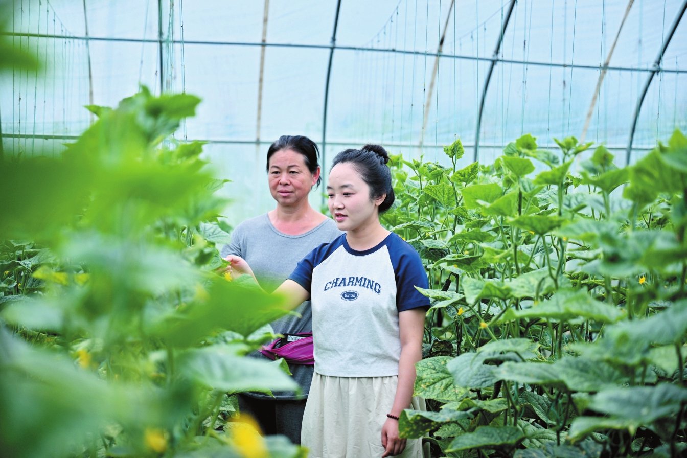 保德縣暖泉村駐村大學(xué)生正在觀察黃瓜長勢(shì)。本報(bào)記者 馮曉磊攝